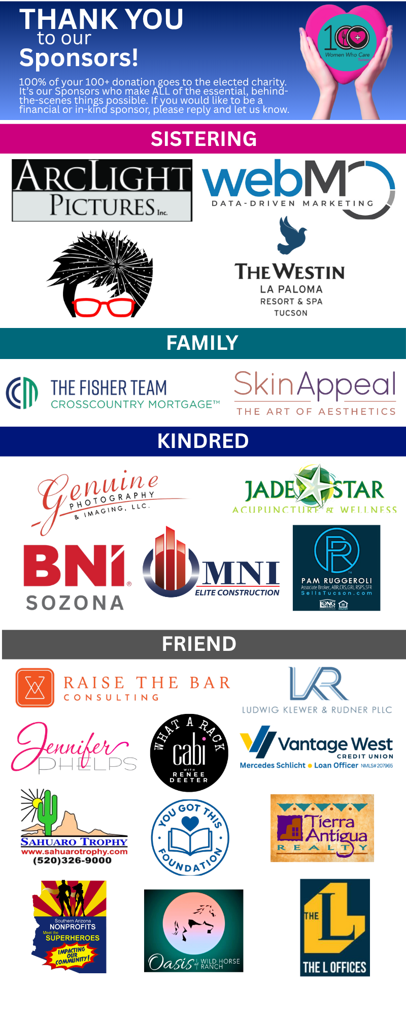 Click here to see our sponsorship opportunities OR here 100wwctucson@gmail.com for more information OR become a sponsor today.